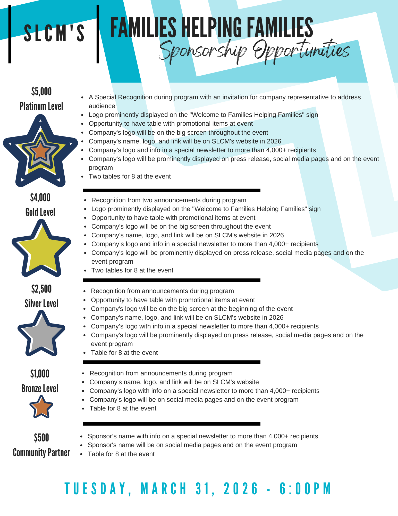 Please join us on Tuesday, March 31st at The Olmsted for our annual dinner, Families Helping Families. Each year we welcome our SLCM family including donors, staff, volunteers, partners and community members as we celebrate all that we've accomplished as a community.